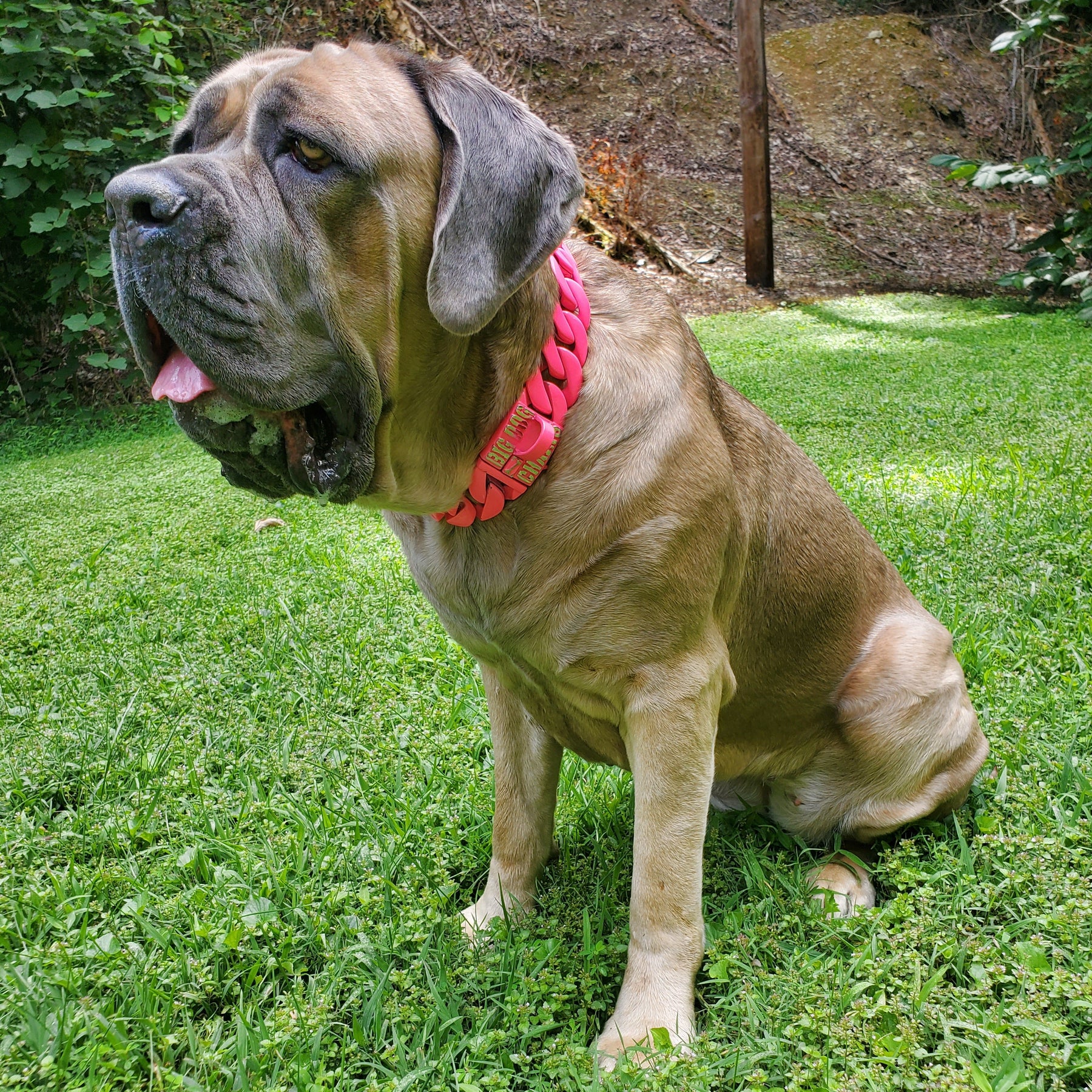 Le collier LOLLIPOP utilise notre célèbre maille cubaine extra-épaisse avec une finition ROSE, idéale pour les grands chiens. Il est le plus grand modèle de collier pour chien que nous ayons jamais fabriqué. Il utilise une maille cubaine de 4,4 cm de large, bien plus large que notre collier KILO , qui mesure 3,2 cm de large. Pour ajouter cette largeur supplémentaire au collier LOLLIPOP , nous avons amélioré notre fermoir pour grand chien, le rendant encore plus résistant. Quelle que soit la taille de votre chien, le collier LOLLIPOP résistera toute sa vie.
